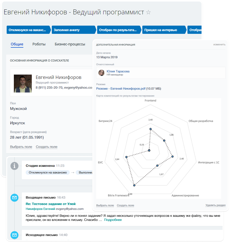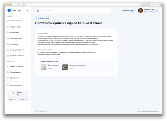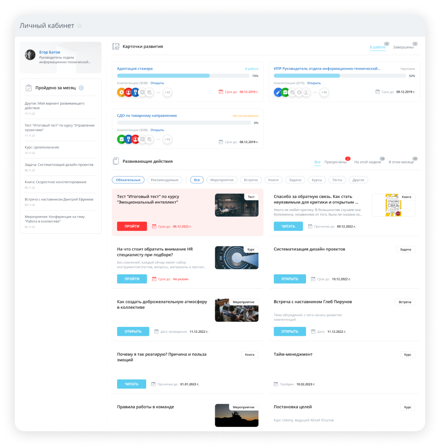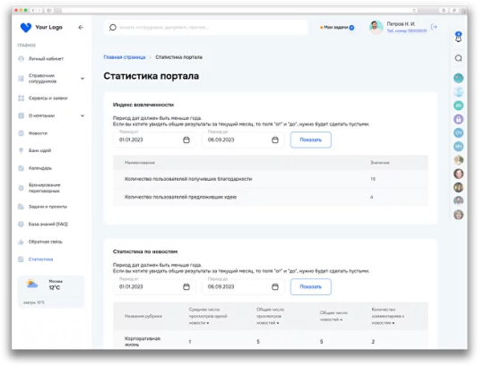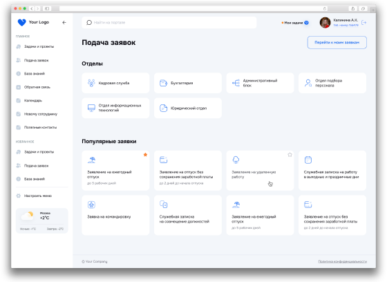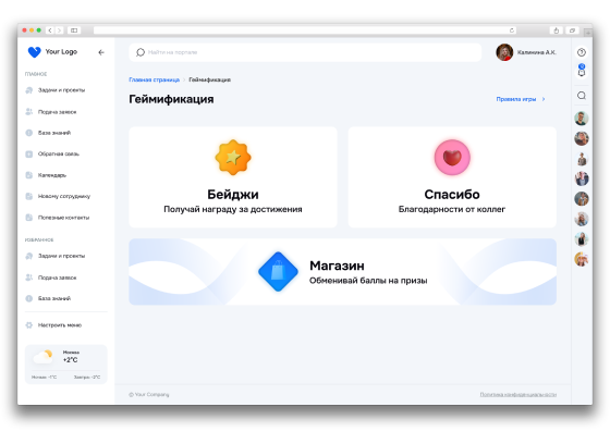 Единый сервис, в котором консолидируется вся информация по сотруднику: личная карточка, благодарности, заявки, активность, регламенты.